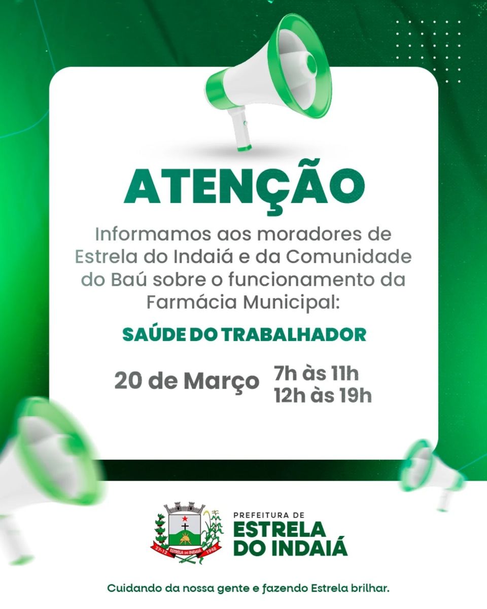 Informamos aos moradores de Estrela do Indaiá e da Comunidade do Baú sobre o funcionamento da Farmácia Municipal no dia 20 de março, com horário especial para atender melhor os trabalhadores.
