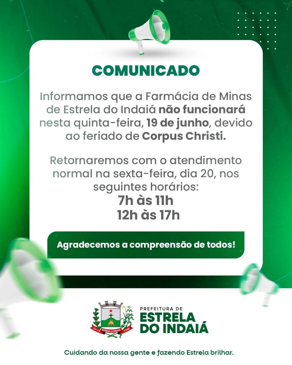 A Farmácia de Minas não funcionará nesta quinta-feira, 19 de junho, devido ao feriado de Corpus Christi.