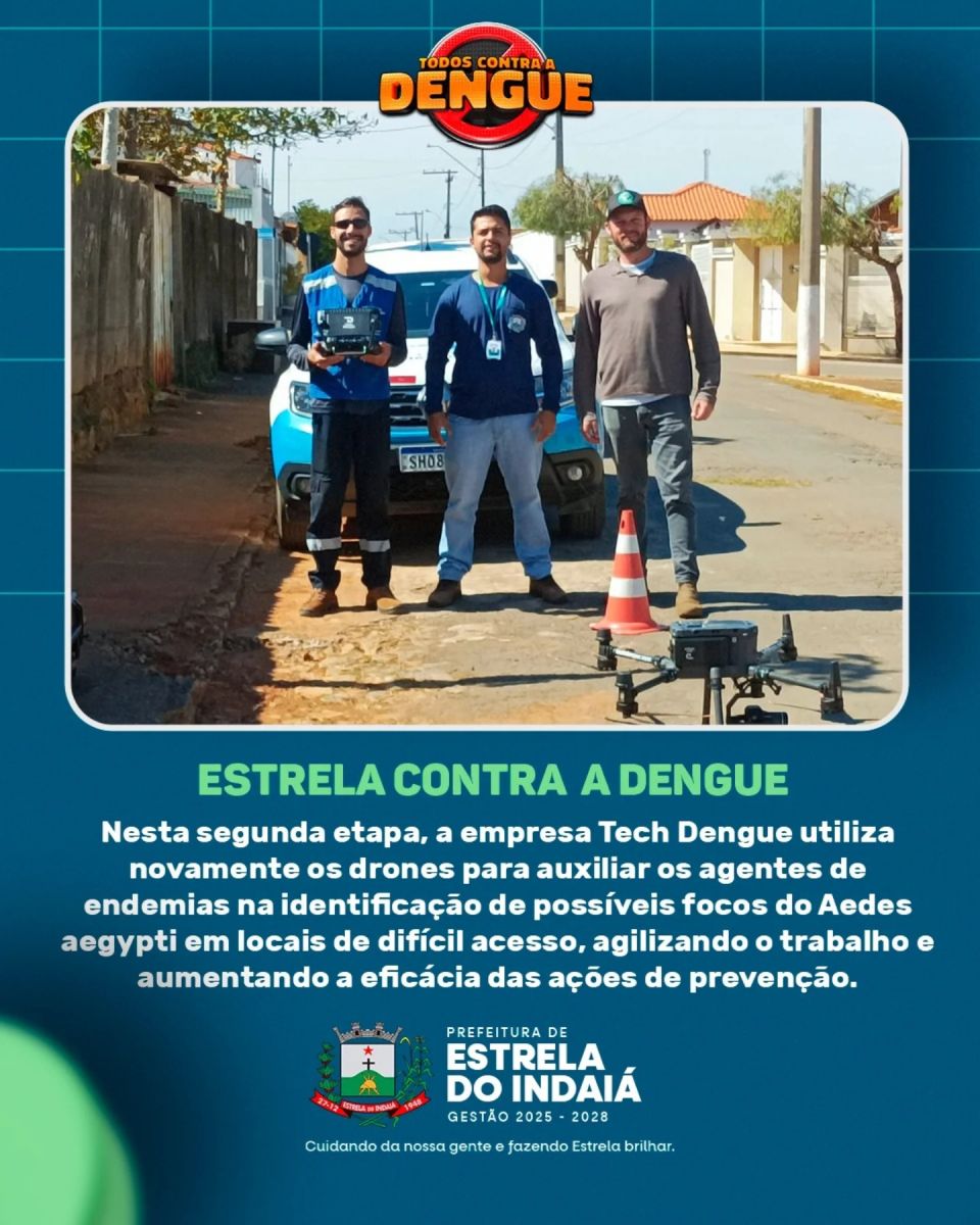 Nesta segunda etapa das ações de combate à dengue, a empresa Tech Dengue está novamente em campo com o uso de drones para auxiliar nossos agentes de endemias na identificação de possíveis focos do mosquito em locais de difícil acesso.
