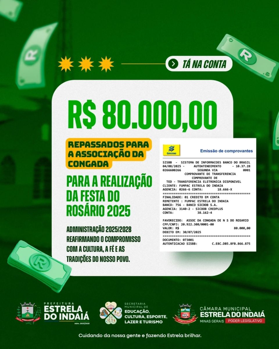 A Prefeitura de Estrela do Indaiá, por meio da Secretaria Municipal de Educação, Cultura, Esporte, Lazer e Turismo, repassou R$ 80.000,00 para a Associação da Congada para a realização da Festa do Rosário 2025!