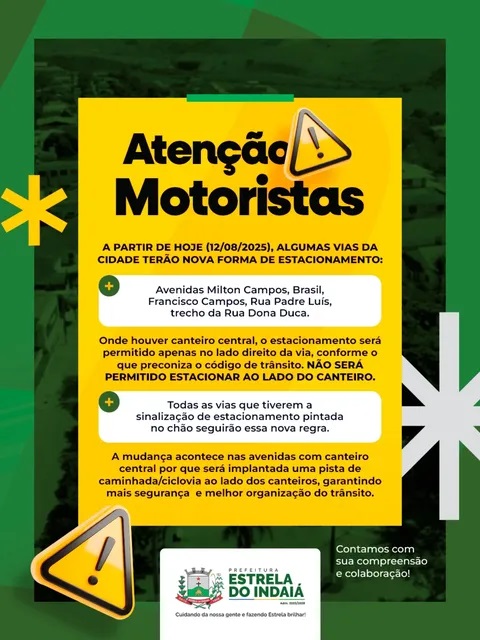 A partir de hoje, 12 de agosto de 2025, algumas vias da cidade de Estrela do Indaiá terão nova forma de estacionamento.
