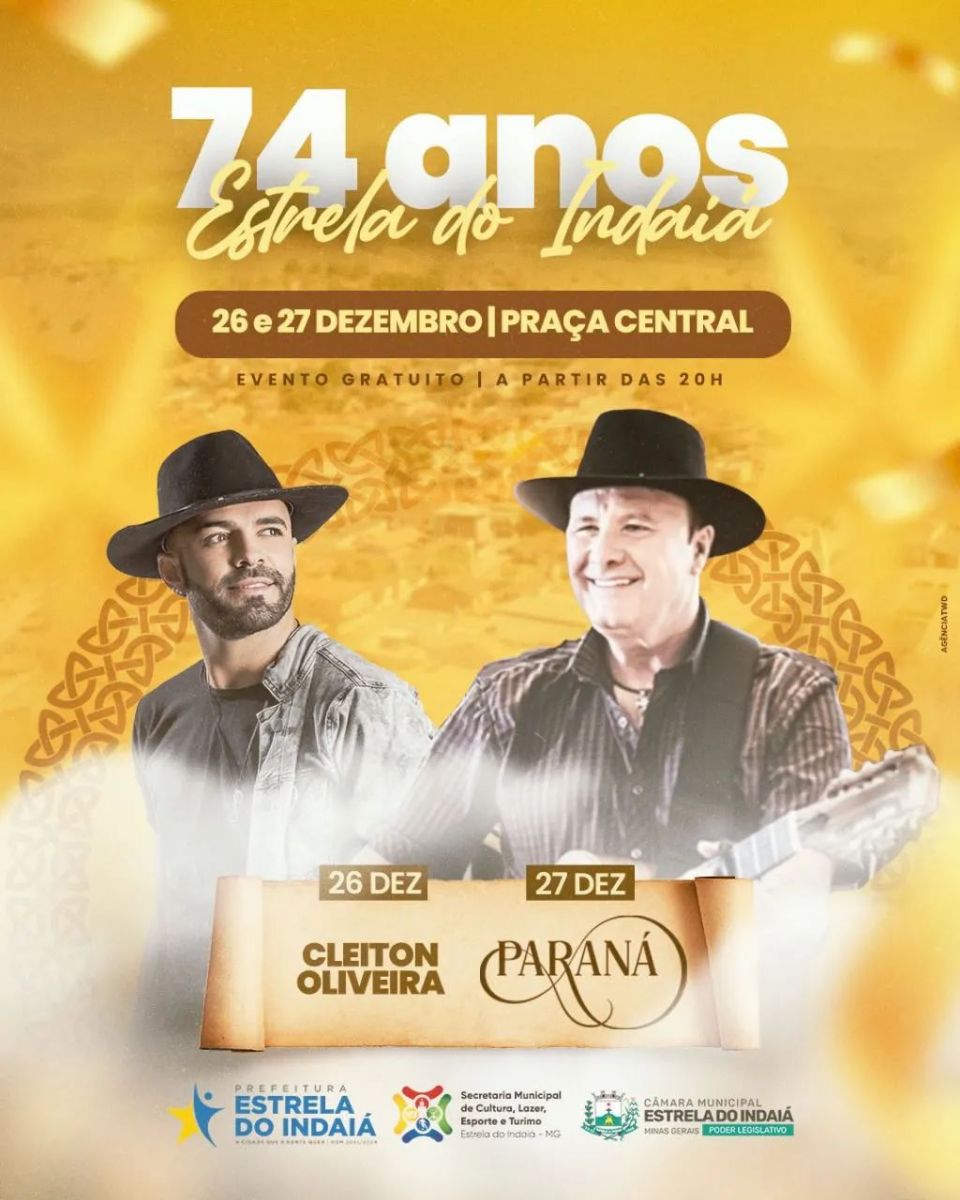 Venha participar das comemorações dos 74 anos de nossa querida Estrela do Indaiá. Será nos dias 26 e 27 de dezembro com grandes atrações.