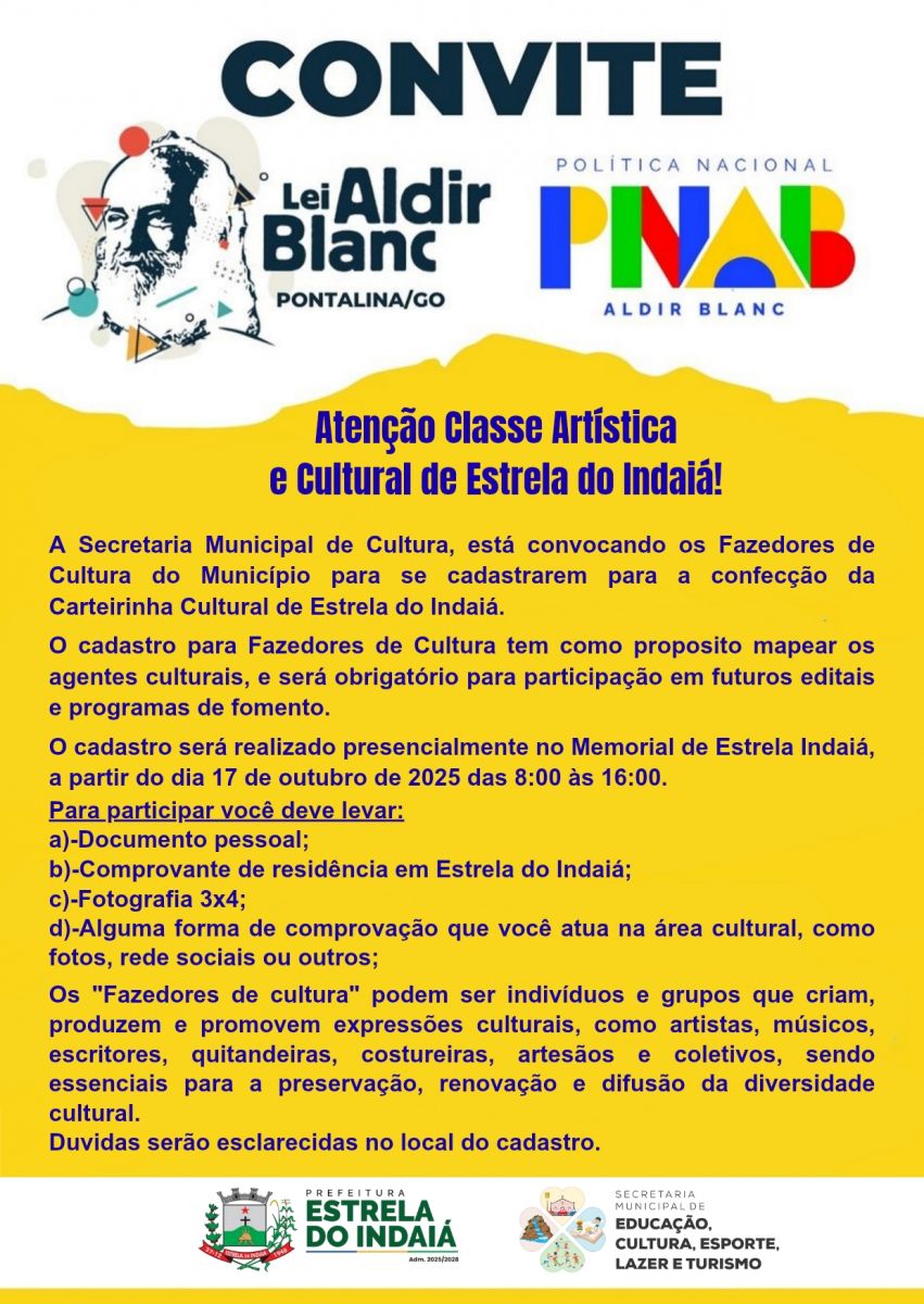 A Secretaria Municipal de Cultura, está convocando os Fazedores de Cultura do Município para se cadastrarem para a confecção da Carteirinha Cultural de Estrela do Indaiá.